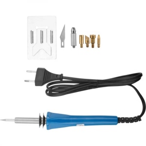 В комплект входит: паяльник, жало для пайки, выжигательные насадки 4 шт., насадка-нож с цанговым зажимом, металлическая подставка.