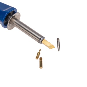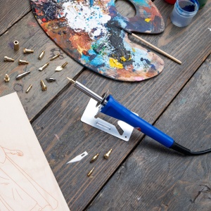 В комплект входит: паяльник, жало для пайки, выжигательные насадки 19 шт., насадка-нож с цанговым зажимом, металлическая подставка.