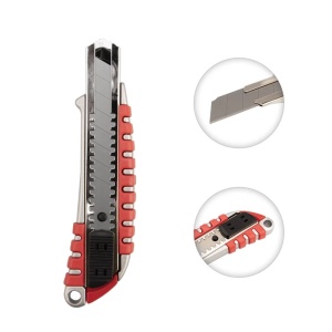 Корпус ножа металлический с обрезиненной рукояткой, что позволяет прикладывать значительное усилие при резке и обеспечивает долгий срок службы.